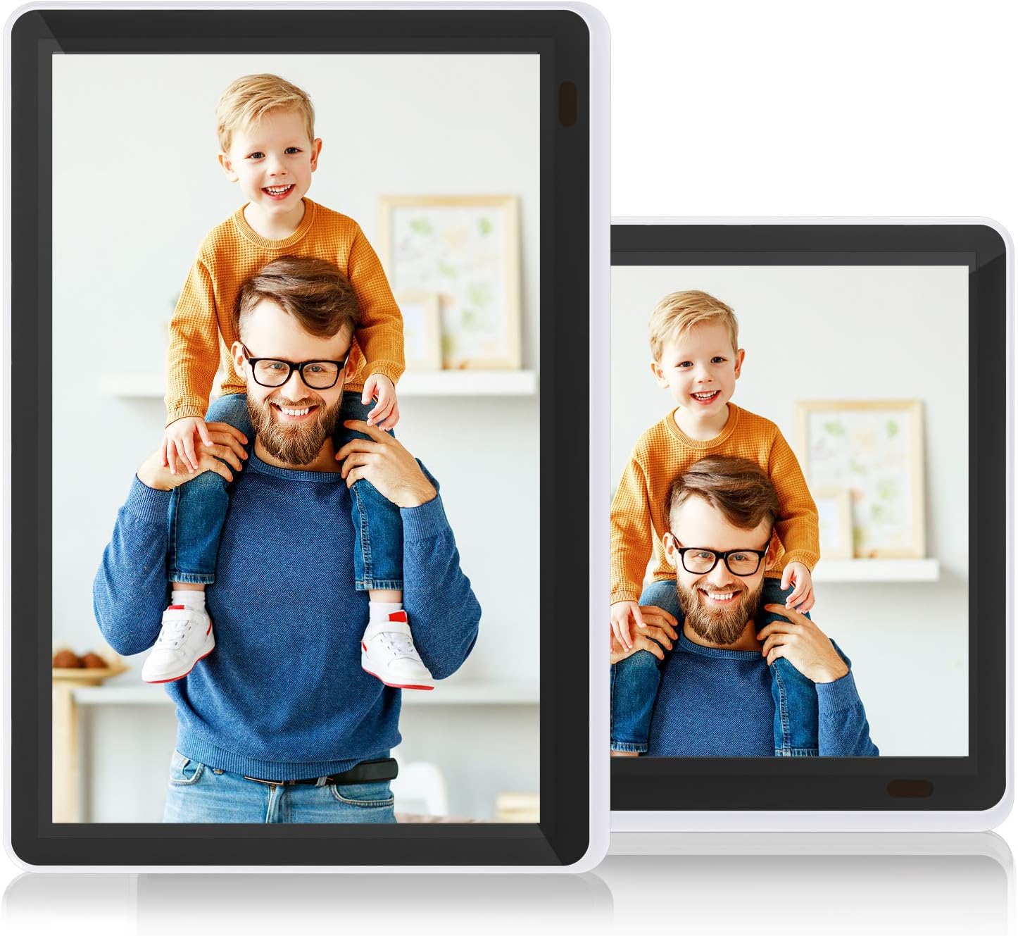 - 【Auto-Rotate & Large Internal Storage】WiFi picture frame can automatically rotate photos to adjust the direction, which allows you to place the WiFi photo album in either portrait or landscape mode or on the wall. 50000 photos can be stored with the generous built-in storage space. And you can insert SD cards or USB Drive (up to 128GB) to expand storage and management.